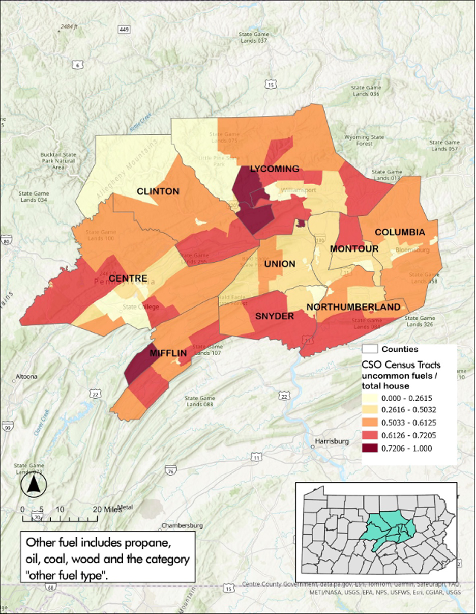 The map below (Figure 1) illustrates our central, PA study area and CSO's service region, highlighting the percentage of households that rely on “uncommon fuels,” as defined by the U.S. Census Bureau’s American Community Survey. This includes households using oil, coal, wood, or other non-standard fuel types. The geographic boundaries, organized by Census Tract, are shaded in increasing red saturation to indicate higher percentages of deliverable fuel users. Several notable patterns emerge from the data: